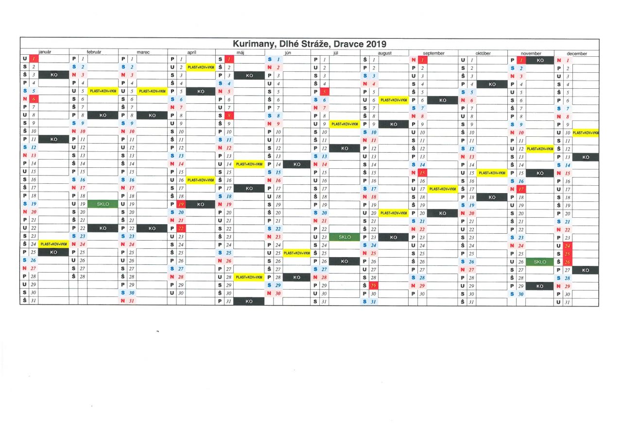 kalendár zberu odpadu v roku 2019